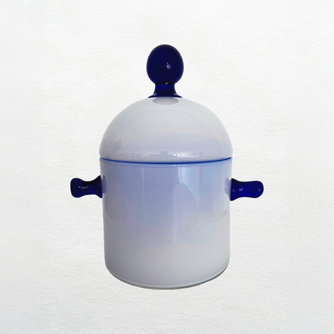Bomboneira artesanal em vidro Murano bicolor, nas cores azul e branco. Peça de design contemporâneo com formato elegante, medindo 13x19x22 cm. Ideal como objeto decorativo ou item de coleção em vidro artístico.